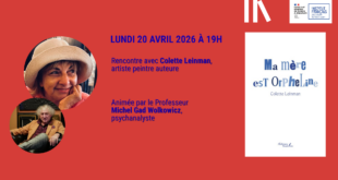 Lundi 20 avril À 19h L’institut français de Jérusalem Romain Gary a le plaisir d’accueillir Colette Leinman, artiste peintre, écrivaine, poète autour de son livre Ma mère est orpheline, paru aux éditions Baudelaire en octobre 2025. Ayant enseigné au département de littérature et de …
