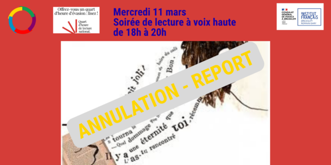 Pour cette cinquième édition et dans le cadre du mois de la Francophonie, l'Institut français de Jérusalem Romain Gary vous invite à une soirée de lectures pour partager le plaisir de lire des textes français qui vous sont chers. Vous disposerez de quelques minutes, pas plus de trois minutes pour lire un texte court, ou un proverbe, ou une phrase de votre choix.